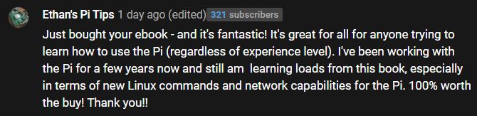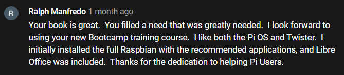 Just purchased your “Master your Raspberry Pi in 30 days”. I have worked in Unix/Linux since the 70s and was somewhat skeptical as to the value of your book. But I have to admit it turned out to be one of my better investments! Thanks